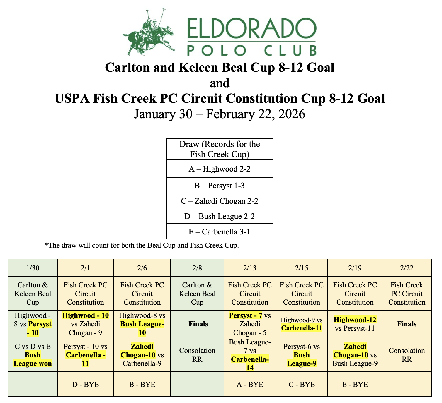 Carlton and Keleen Beal Cup 12 Goal USPA PACIFIC COAST CIRCUIT FISH CREEK CONSTITUTION CUP 12 GOAL Tournament Conditions & Rosters